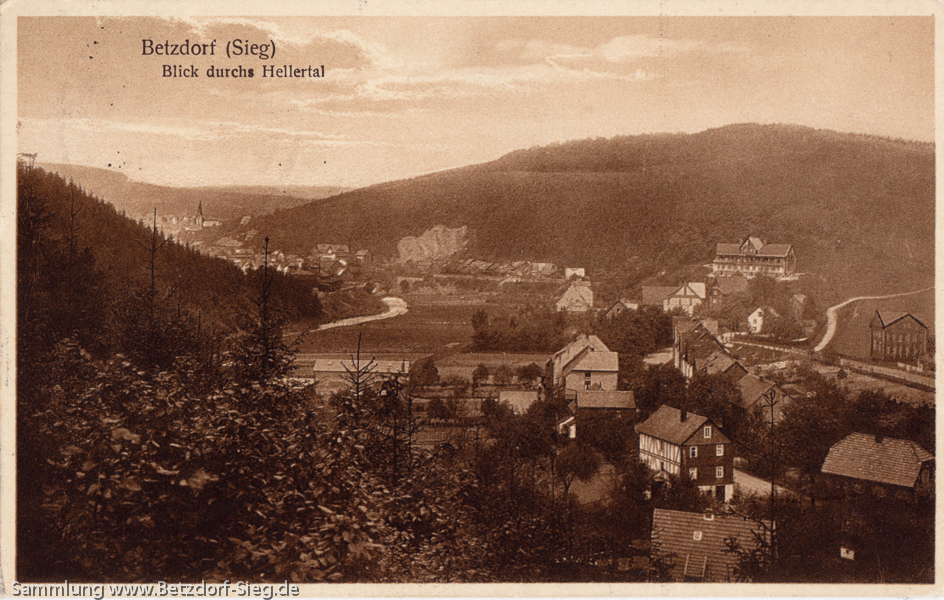 Blick durchs Hellertal von Alsdorf nach Betzdorf - 1931 Blick vom Alsberghang über Hauptstraße hin zur Friedrichstraße. Rechts im Bild am Eingang zum Imhäusertal: Haus Krupp