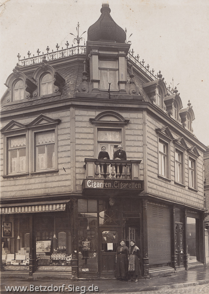 Nach dem Obst- und Gemüsegeschäft Boquoi zog hier Adam Quirbach Söhne ein, um Tabakwaren und die entsprechenden Utensilien (siehe die Pfeifen im Fenster neben der Tür) zu verkaufen. Cigarren und Cigaretten (so stand es über der Tür, während im Schaufenster die Worte schon mit "Z" geschrieben standen.) en detail - wie es damals noch vornehm hieß.