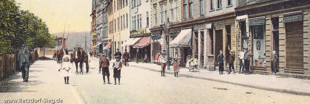Bahnhofstraße 1908 - Detail Straßenszene: Fast alle tragen Kopfbedeckungen. Viele Kinder. Pferdefuhrwerke