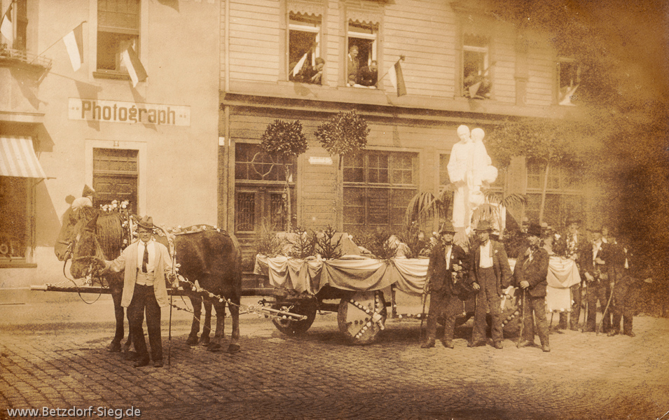 In der Bahnhofstraße - vor der Photographischen Anstalt und dem Restaurant von Friedrich Blecher - aufgenommen: Jubiläumsumzug des katholischen Gesellenvereins (1921). Bei der weißen Figur auf dem Wagen handelt es sich um eine Nachbildung des Kolping-Denkmals (mit Kind auf dem Arm). Das Original steht in Köln, eine Kopie stand im ersten Kolpinghaus in der Burgstraße, doch haben Denkmal und Haus den Krieg nicht überstanden.